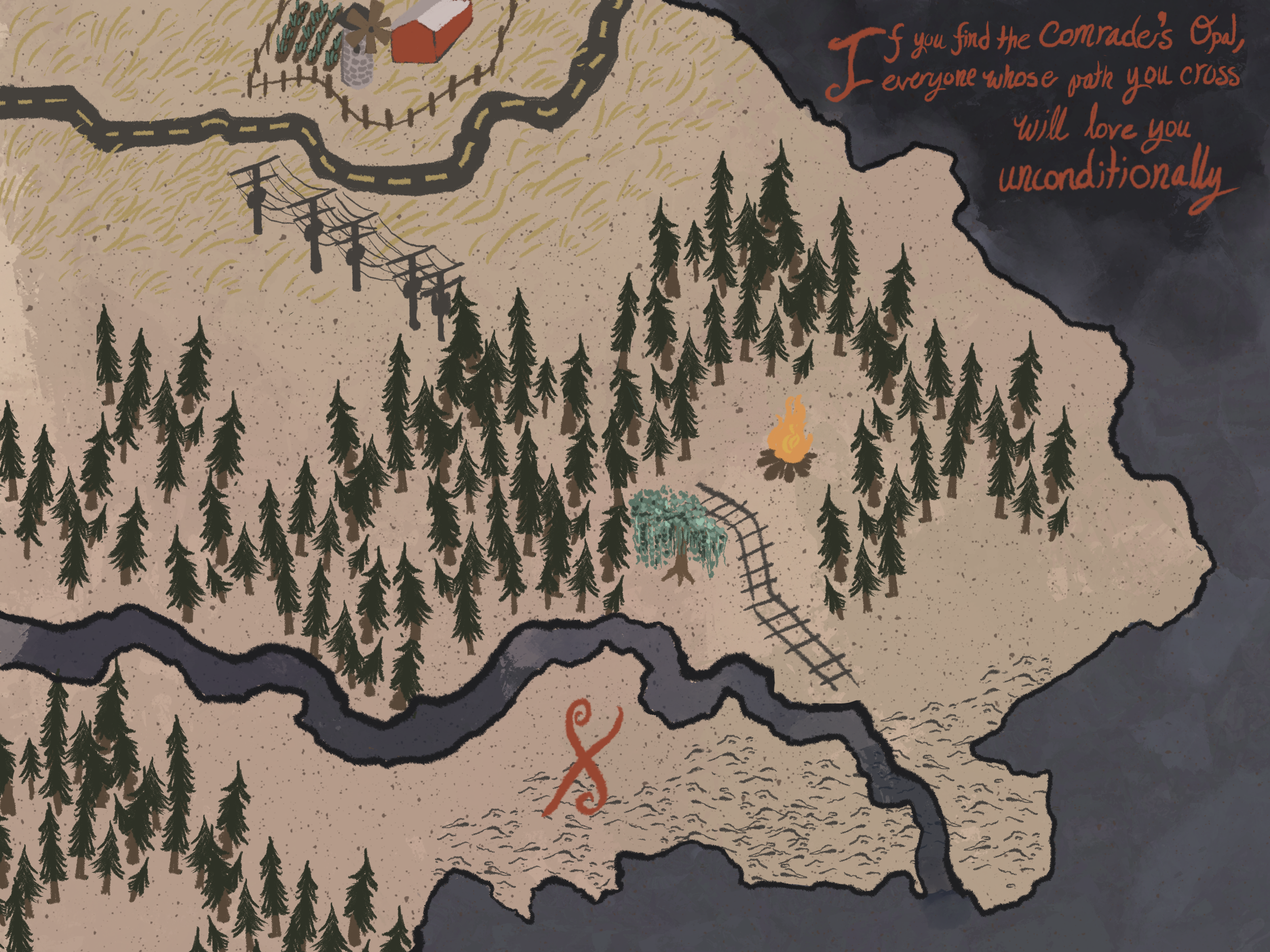 In addition to the credit illustrations, I was tasked with creating a prop: the map the main characters use throughout the narrative. To create a weathered look on the edges, I carefully burned the sides of the print. Both the digital image and the prop itself are pictured nearby.